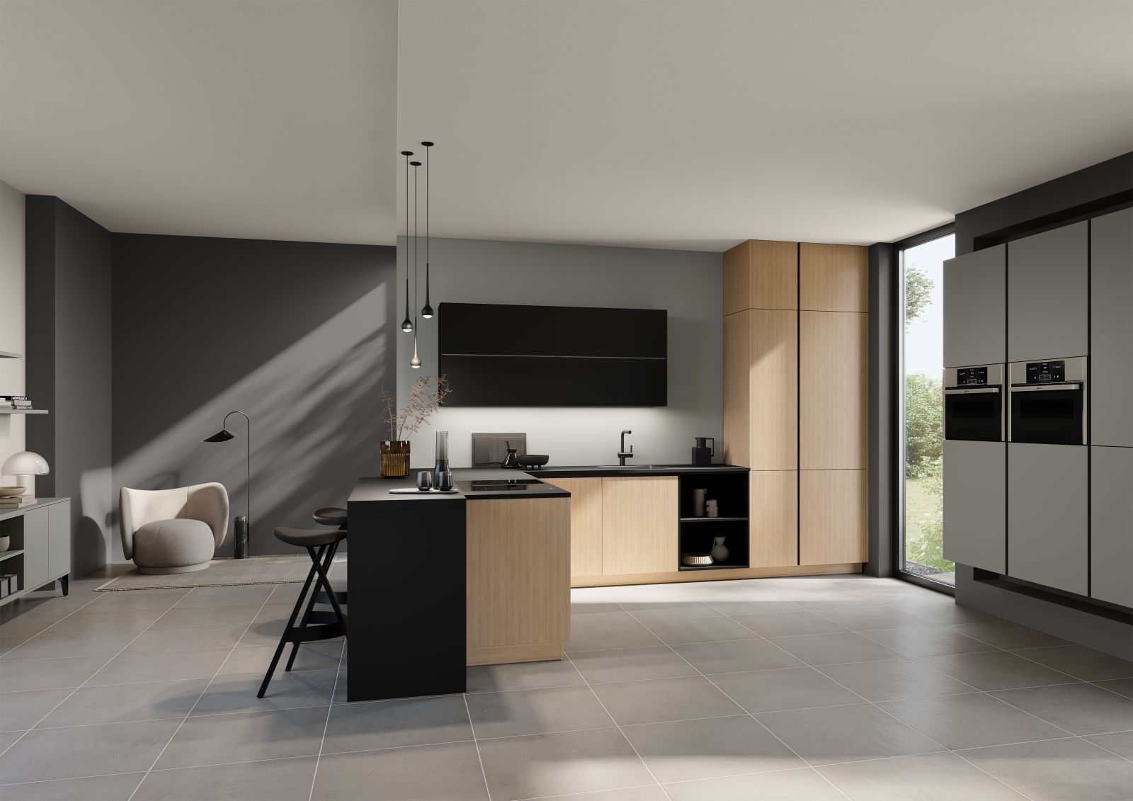 Система AV 6000-GL сочетает мягкие поверхности с функциональной элегантностью. Открытая кухня завоевывает внимание благодаря умелому использованию пространства с парящими высокими шкафами. Электроприборы на эргономичной высоте и интегрированная рабочая зона объединяют практичность и универсальность.
